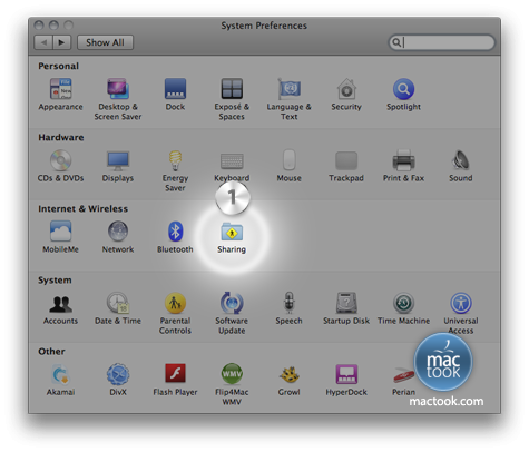 أولاً : من الجهاز المتصل بالإنترنت قم بالدخول على خيار Sharing من System Preferences :