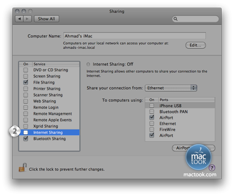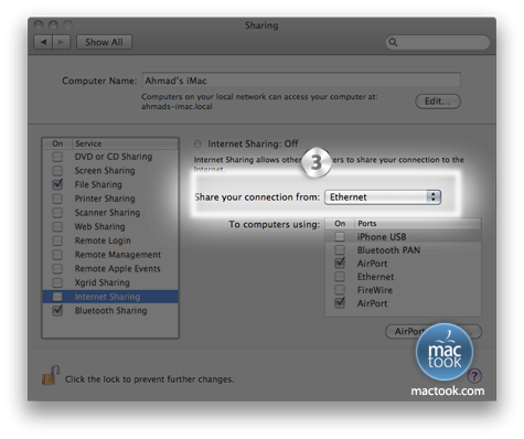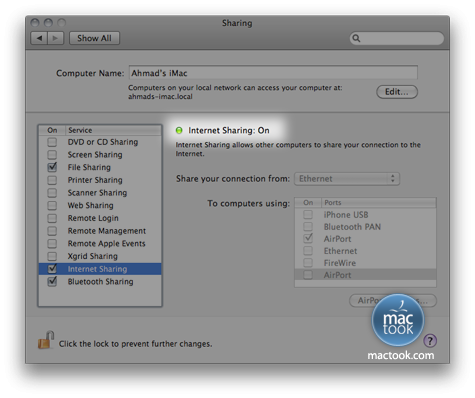 (مشاركة الإنترنت Internet Sharing ) خيار لمشاركة الإتصال بالإنترنت من خلال جهازك ، هذه الخاصية قد تكون مفيدة جداً وعملية في بعض الحالات ، فمثلاً إذا كنت متصل بالإنترنت عن طريق Ethernet وتريد مشاركة جهاز آخر لديك في الدخول للإنترنت وفي نفس الوقت لا تستطيع الدخول لشبكة Wi-Fi لأي سبب أو لا توجد شبكة نهائياً فما هو الحل ؟ الحل هو مشاركة الإنترنت عن طريق جهازك بتفعيل هذه الخاصيه ومشاركة أي أجهزة أخرى عن طريق تفعيل الإتصال بالإنترنت بإستخدام خيار Wi-Fi .