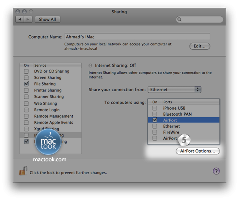 خامساً : إذا أردت وضع كلمه سر للإتصال بالإنترنت من خلال Wi-Fi الخاص بجهازك كل ما عليك فعله هو الضغط على AirPort Options :