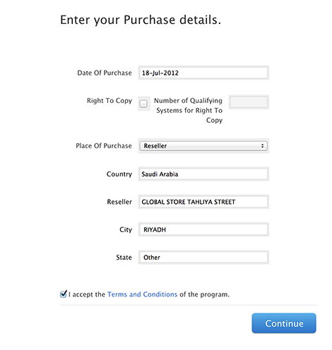 Reseller : اسم محل التجزئه الذي اشتريت منه جهازك ( iStyle – Global Store – iCorner ..etc )، ملاحظة فقط اكتب اول حرفين من اسم المحل وستجد موقع ابل اكمل عنك بقية الاسم و الخانات المتبقية، الآن اضغط Continue