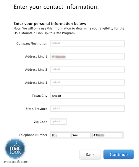 Telephone Number : رقم هاتفك، اكتب في الخانة الأولى فتح الخط الدولي الخاص بدولتك، الخانة الثانية اكتب فيها فتح خط مدينتك ان كان هاتف ارضي او ثابت اما ان كان جوال فاكتب اول ثلاثة ارقام منه بدون صفر، والخانة الاخيره اكتب فيها باقي الرقم، اما باقي الخيارات اختيارية .. الآن اضغط على زر Continue
