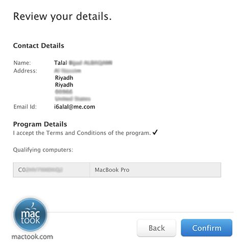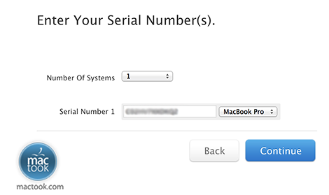 الآن وبعد ادخال رقم السيريال، اختر نوع جهازك من القائمة المنسدلة واضغط زر Continue، ولـملاّك اجهزة MacBook Pro Withe Retina Display يختارون من القائمة MacBook Pro