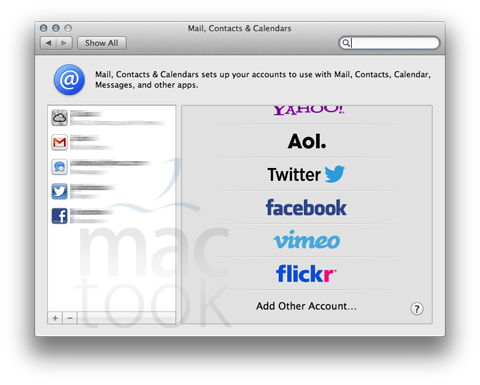 كل ما عليك فعله هو تحميل الإضافة من خلال الرابط الموجود في آخر المقال وتنصيبها بشكل عادي في النظام بعد التنصيب ستجد أن الإضافة الخاصة بالـ Facebook متوفرة ضمن خيارات المشاركة في النظام ، طبعاً يجب عليك أن تقوم بإدخال معلومات حسابك في Facebook وذلك من خلال System Preferences ومن ثم خيار Mail,Contacts & Calendars كما في الصورة :